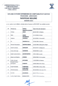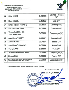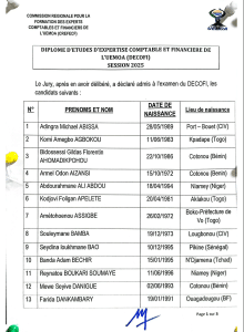 Le Conseil de l’Ordre National des Experts Comptables et des Comptables Agréés du Burkina Faso (ONECCA-BF) présente ses sincères félicitations aux quarante trois (43) laureats du Diplôme d’Expertise Comptable et Financière (DECOFI) de niveau doctorat et aux trois cent cinquante neuf (359) admis au Diplôme d’Etudes Supérieures de Comptabilité et de Gestion Financière (DESCOGEF) de niveau master (BAC+5), session 2025.